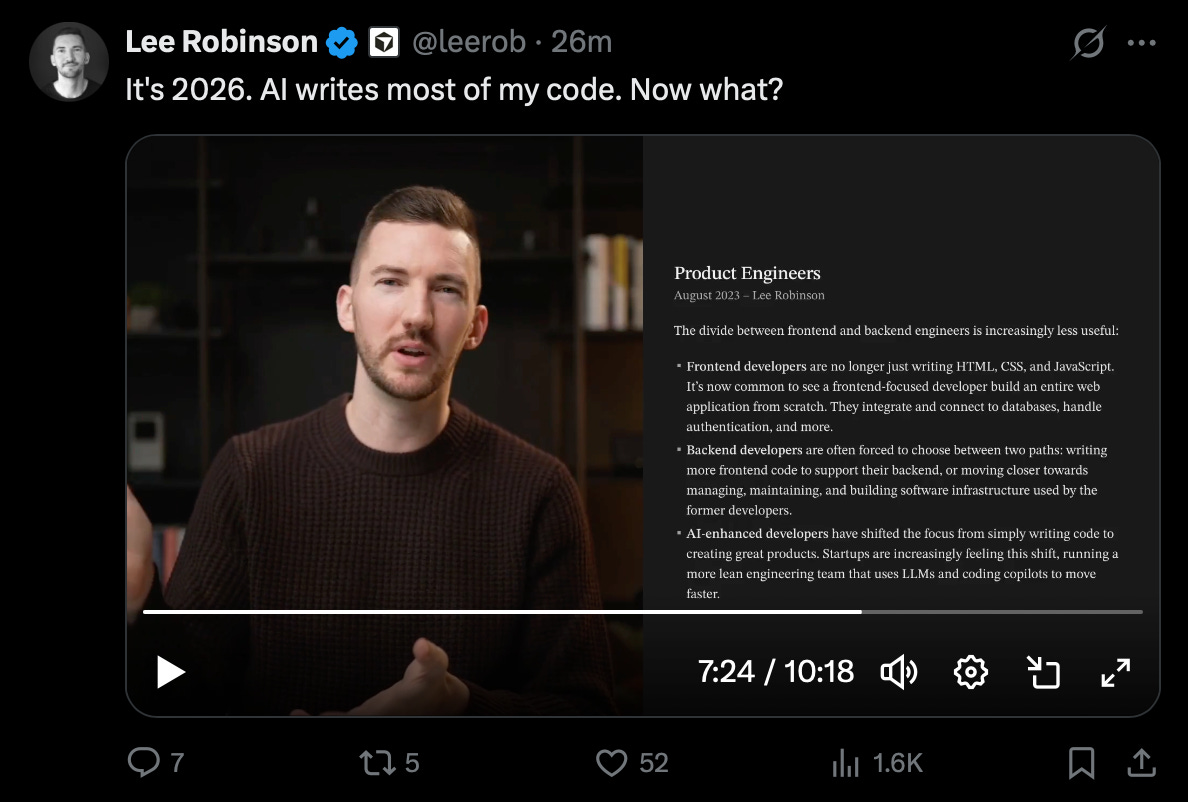 This trend is driven by AI-assisted coding doing most of the heavy lifting. Lee Robinson, a Cursor educator, talked about this in his latest video, where he encourages engineers to focus on learning UX, product thinking, distribution, and marketing the product.