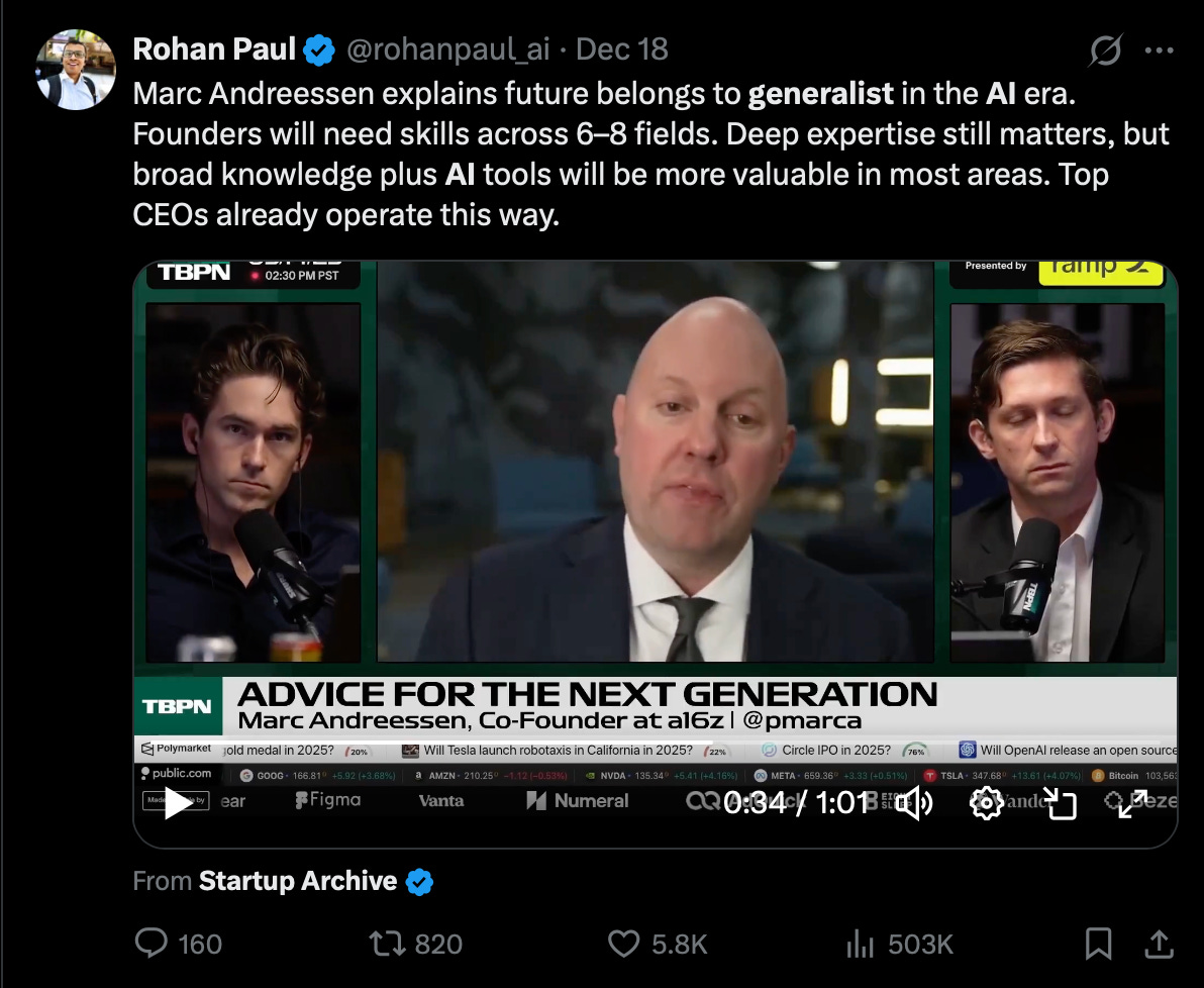 Marc Andreessen, co-founder of a16z, echoed a related idea when he stated that the best founders will have deep skills across 6-8 different areas.