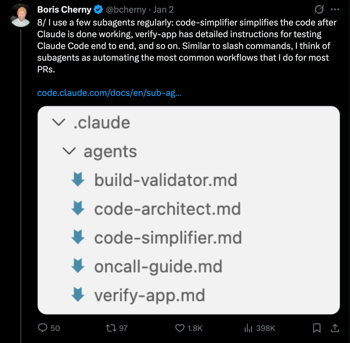 For example, Boris Cherny the creator of Claude Code, shares his agentic workflow and a number of sub-agents he uses regularly to verify code.