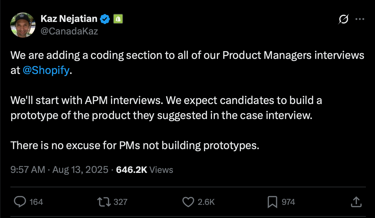 Shopify’s COO announced on X that Shopify is adding a coding portion to every Product Manager interview, starting with Associate Product Managers.