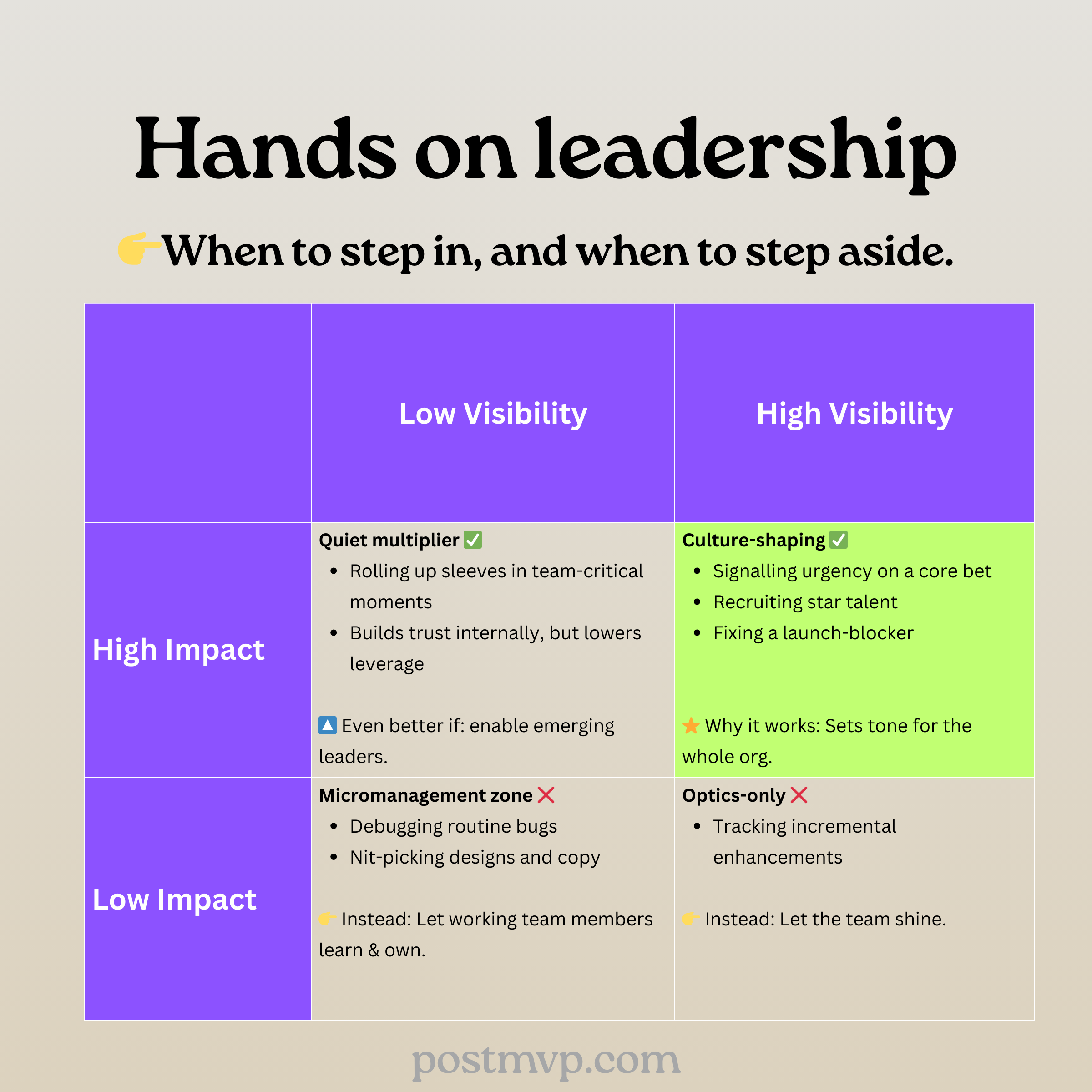 For Executives/Leaders, be intentional with jumping in. Seek high-value-add, high-leverage opportunities.