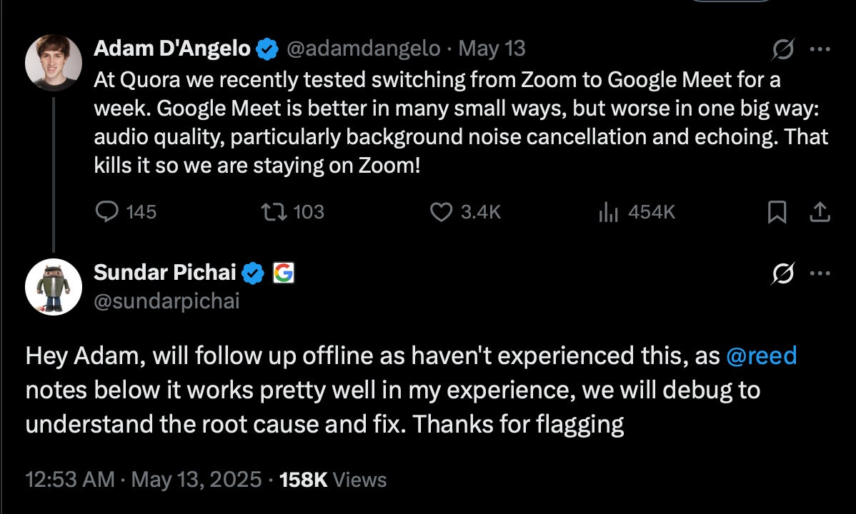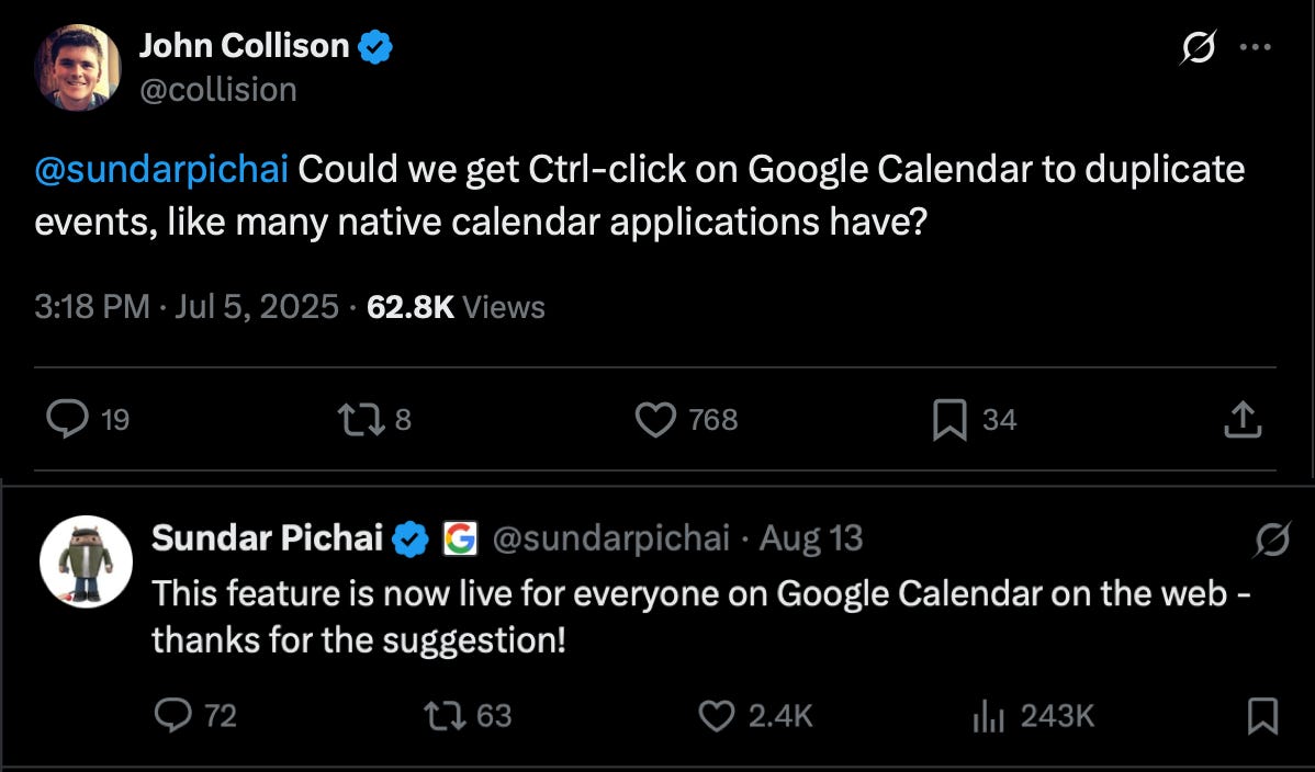 Stripe’s co-founder put in a Google Calendar feature request on July 5th. By August 13th, Pichai himself replied on X: the feature was live.