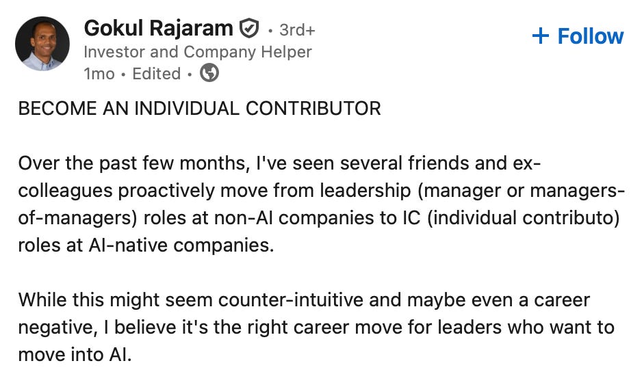 And at the leadership levels, reports from Product Leader & Investor Gokul Rajaram’s network show mid-level managers and VPs are trading management seats for IC PM roles in AI companies.