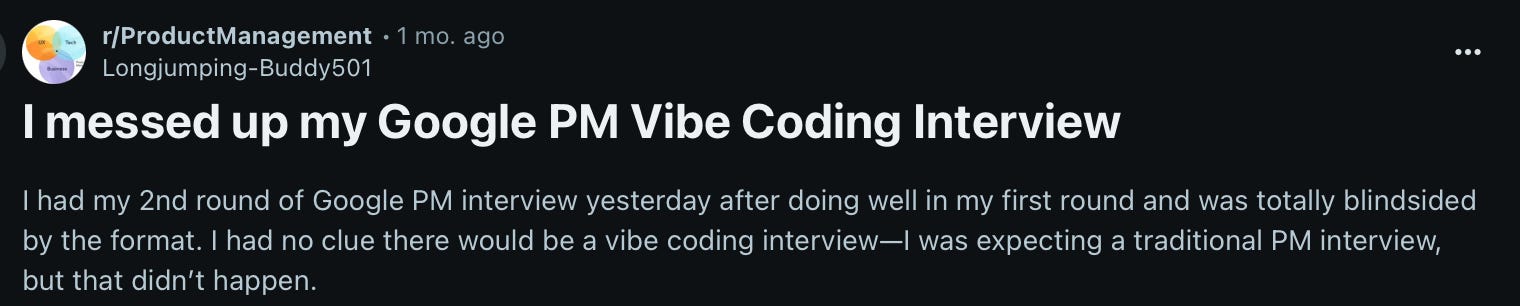 This follows a viral Reddit post about a Google PM interview that rattled the product job seekers community: “I messed up my Google PM Vibe Coding Interview”.