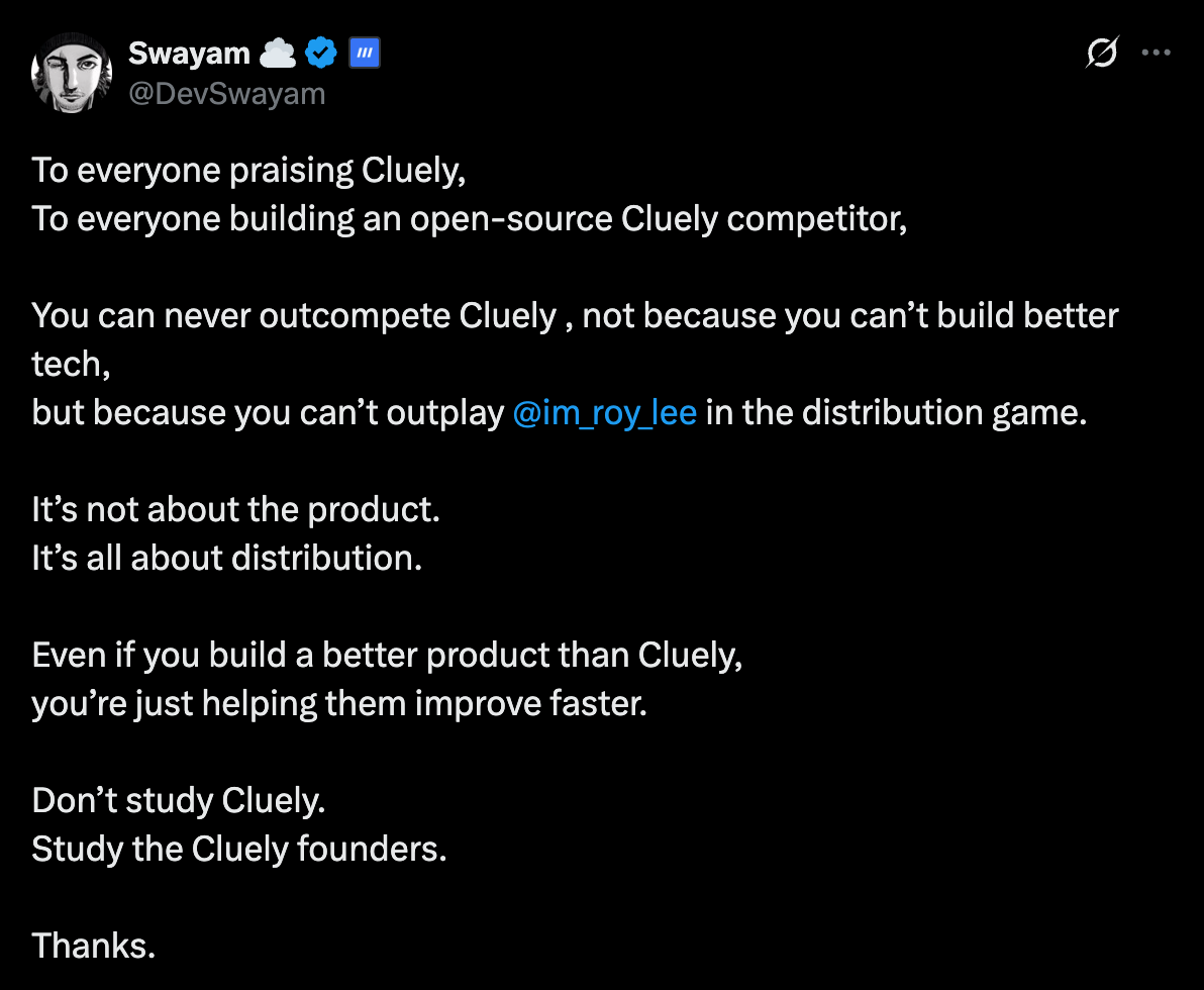 Folks on X, like @DevSwayam argue that Cluely’s distribution is the moat. A recent Andreesen Horowitz blog boldly states momentum is the moat.
