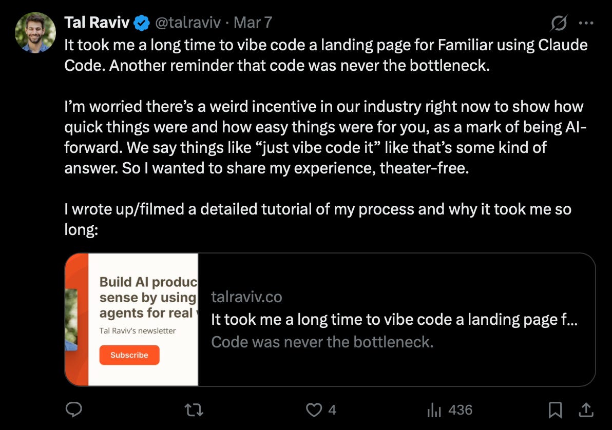 A great example of how being a PM still takes hard work is Tal Raviv’s essay on vibe coding a landing page for Familiar