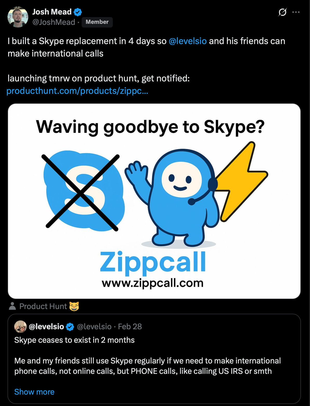 And guess what? ZippCall swooped in to serve this exact niche. And the whole product was built in 4 days. Take that, Skype.