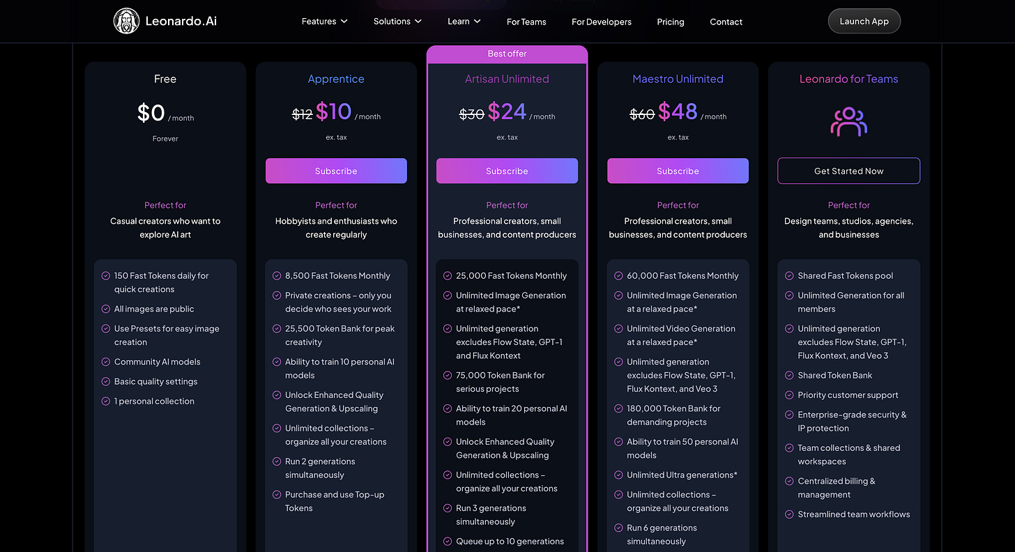 Example: Leonardo AI assigns tokens per subscription tier, which allow you to generate a certain number of images per month.