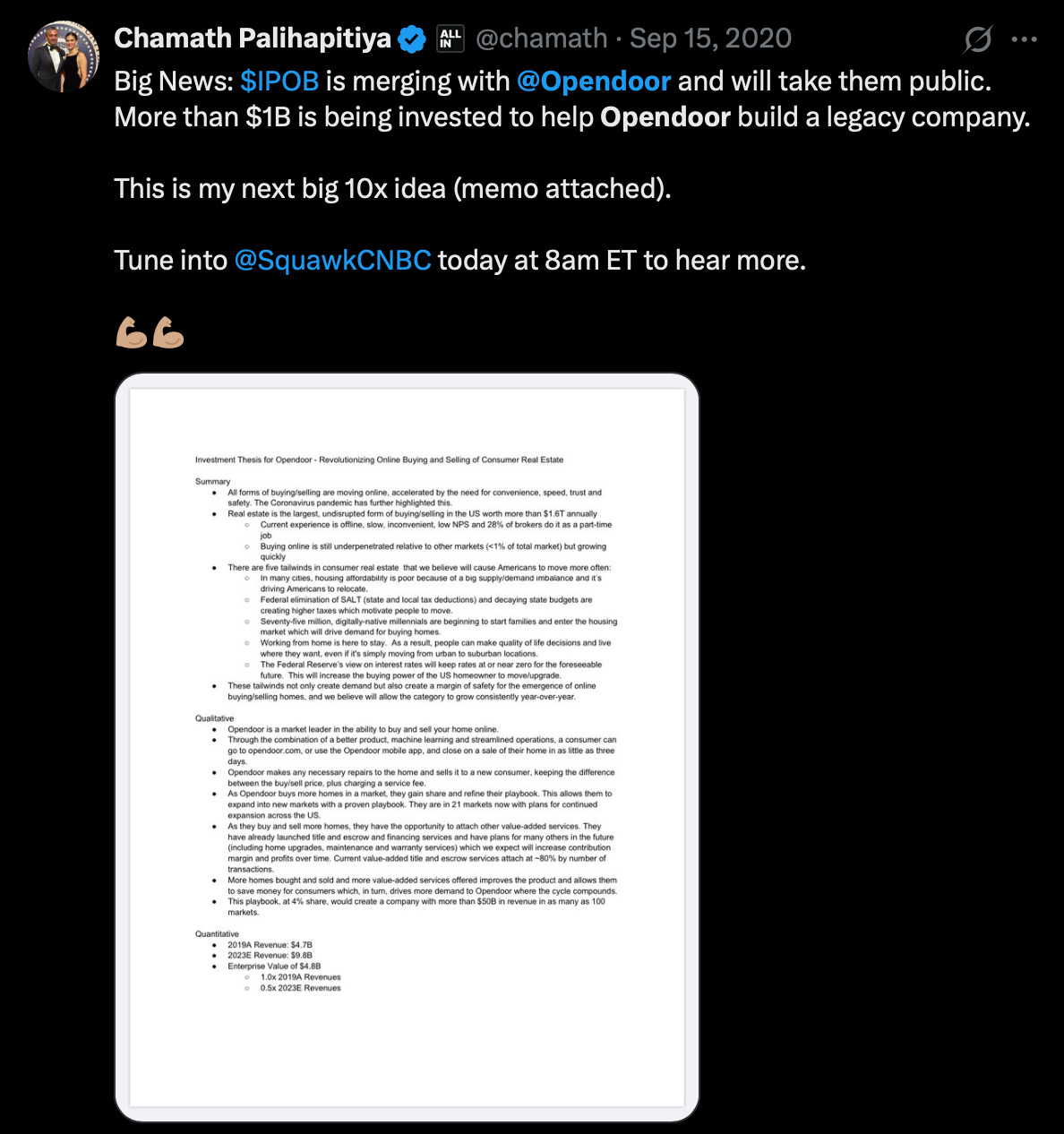 Back during the SPAC craze of 2020, Opendoor went public through a SPAC (Special Purpose Acquisition Company) led by Silicon Valley venture capital investor Chamath Palihapitiya. At the time, Chamath’s infamous one-pagers painted iBuying as a category-defining revolution.
