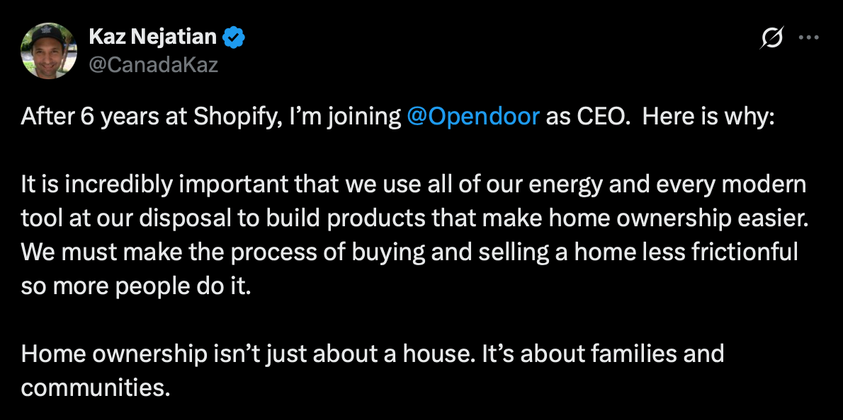 Big product news this week: Shopify’s COO Kaz Nejatian has left Shopify to become the CEO of Opendoor, an online platform for buying and selling homes.