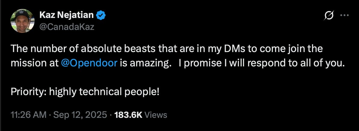September 2025: Co-founders Eric Wu and Keith Rabois rejoined the board, investing $40M of their own money into the company. Shopify’s ex-COO Kaz Nejatian steps in as CEO of Opendoor.