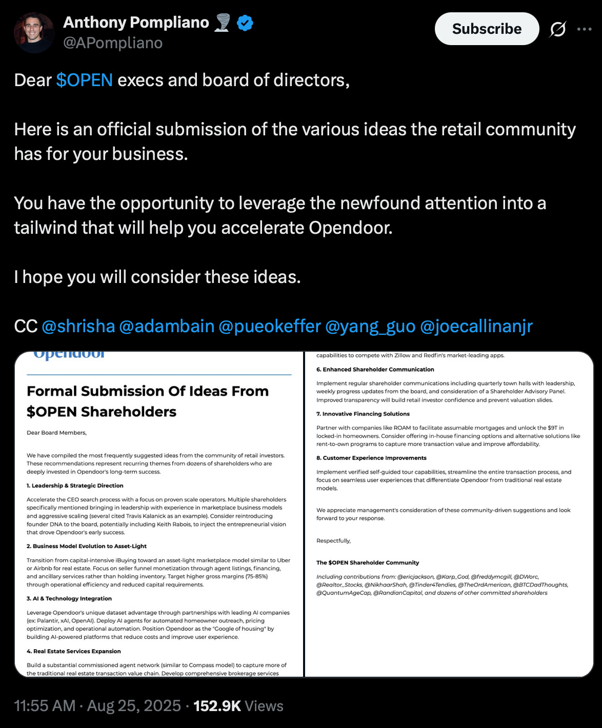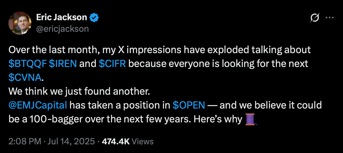 July 2025: Shares started to rally after Eric Jackson (EMJ Capital) went public with his bullish thesis about Opendoor on X.