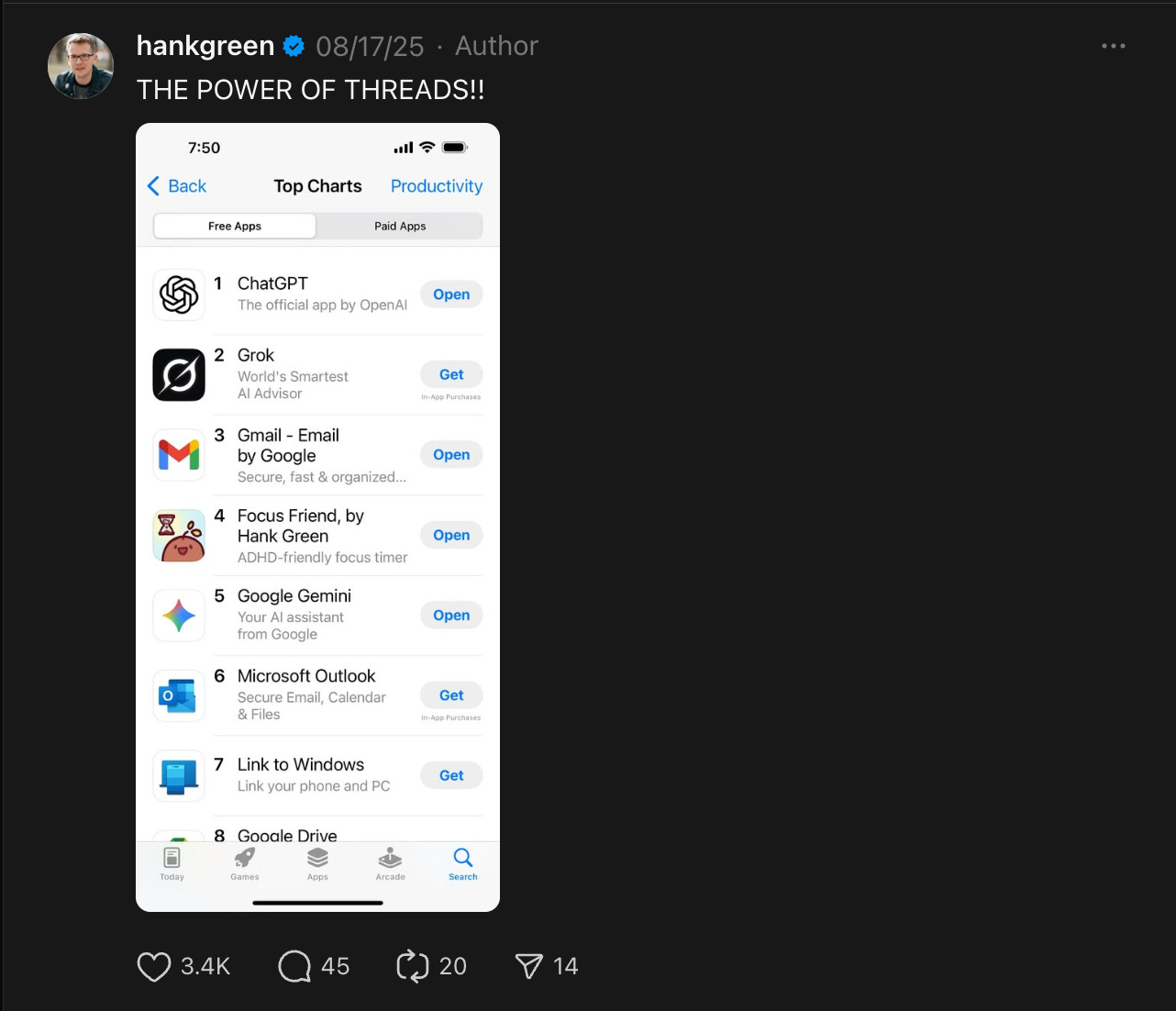 Hank Green, a YouTuber with over 2.5M followers, recently launched Focus Friend, which hit #4 in the App Store simply by Hank sharing it on Threads.