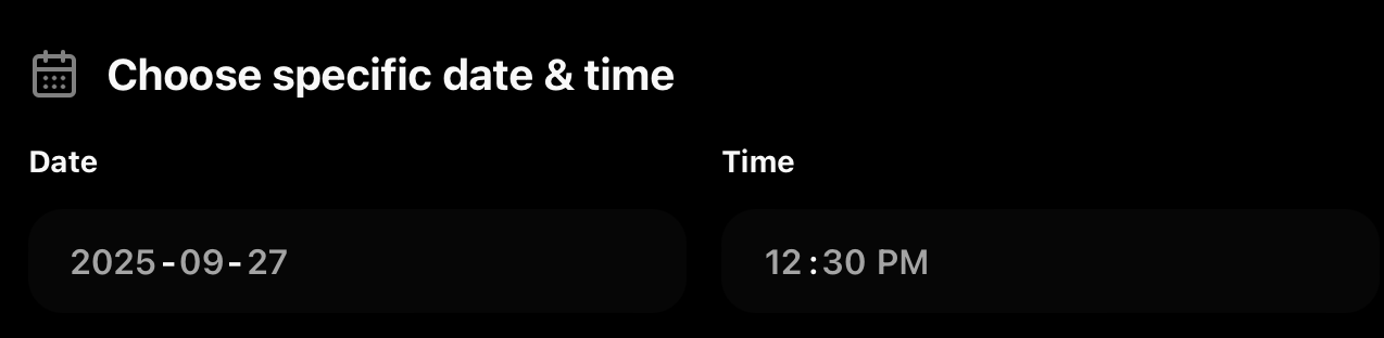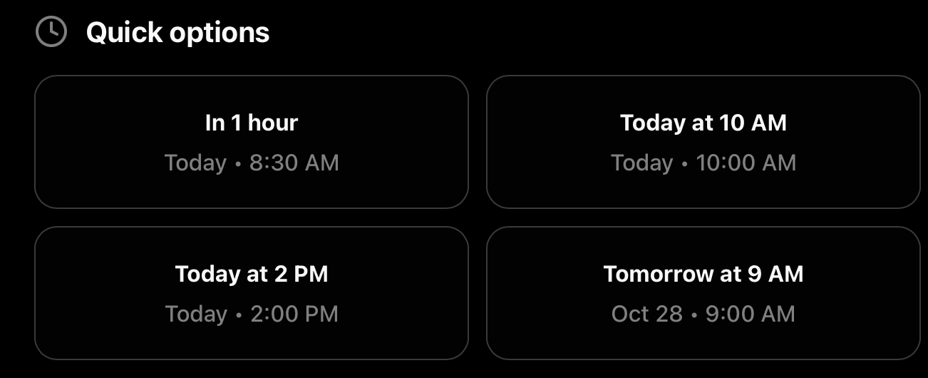 Quick Options → 4 large, tappable buttons for common times (e.g., “in 1 hour,” “today at 2PM”).