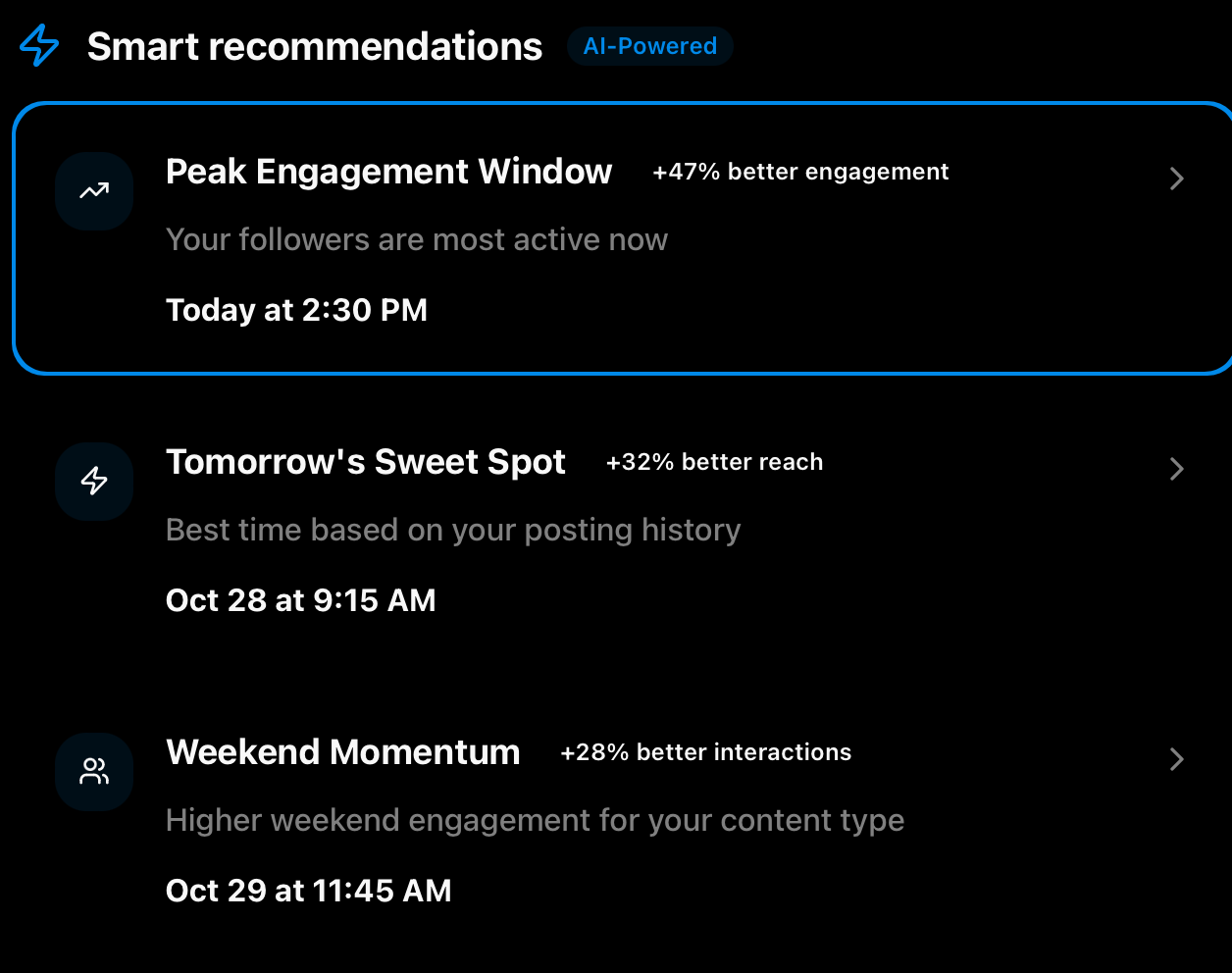 Smart Suggestions → System recommends 2–3 optimal posting windows based on past engagement + follower activity.