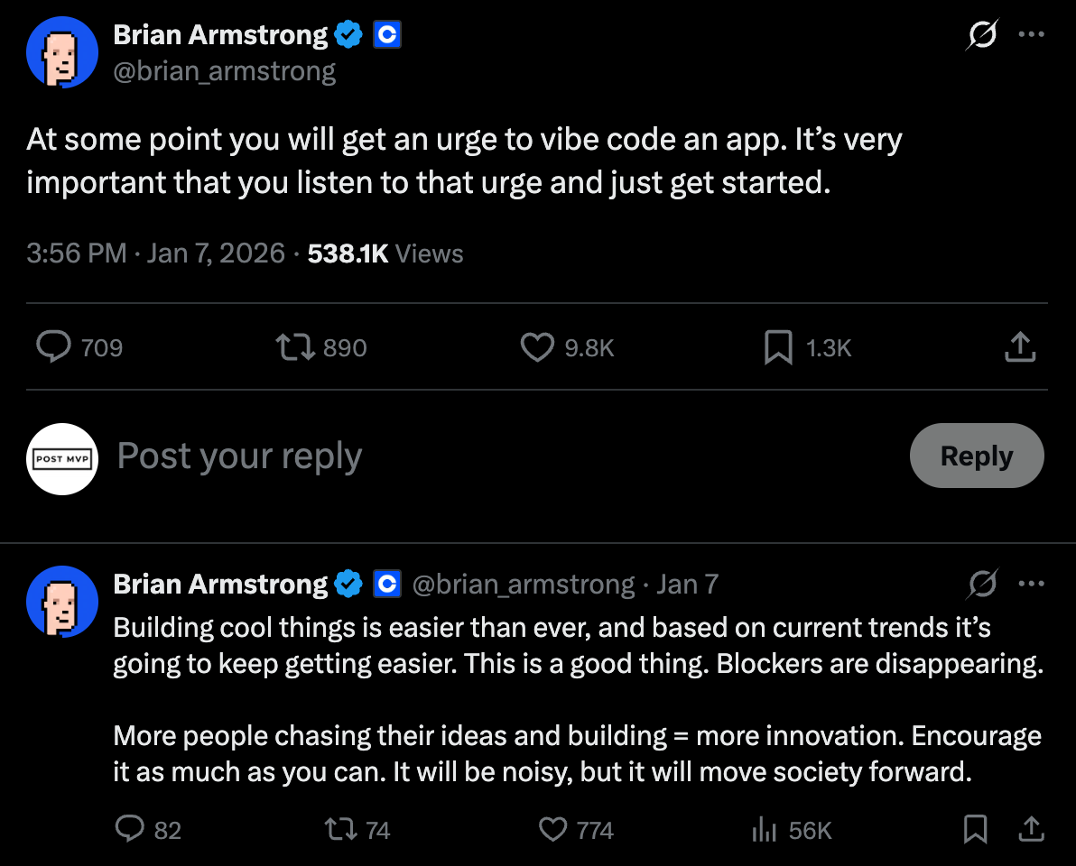 As Brian Armstrong, CEO of Coinbase writes, if you’re feeling an urge to learn vibe coding, follow the urge with whatever problem you’re facing or idea you have.