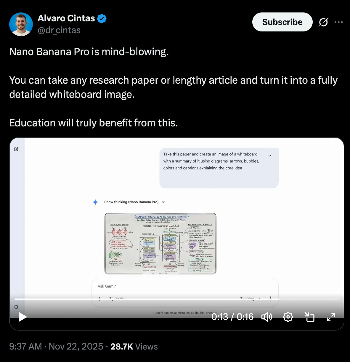 Right now, people are using Nano Banana Pro to create whiteboards from academic papers or long YouTube videos.