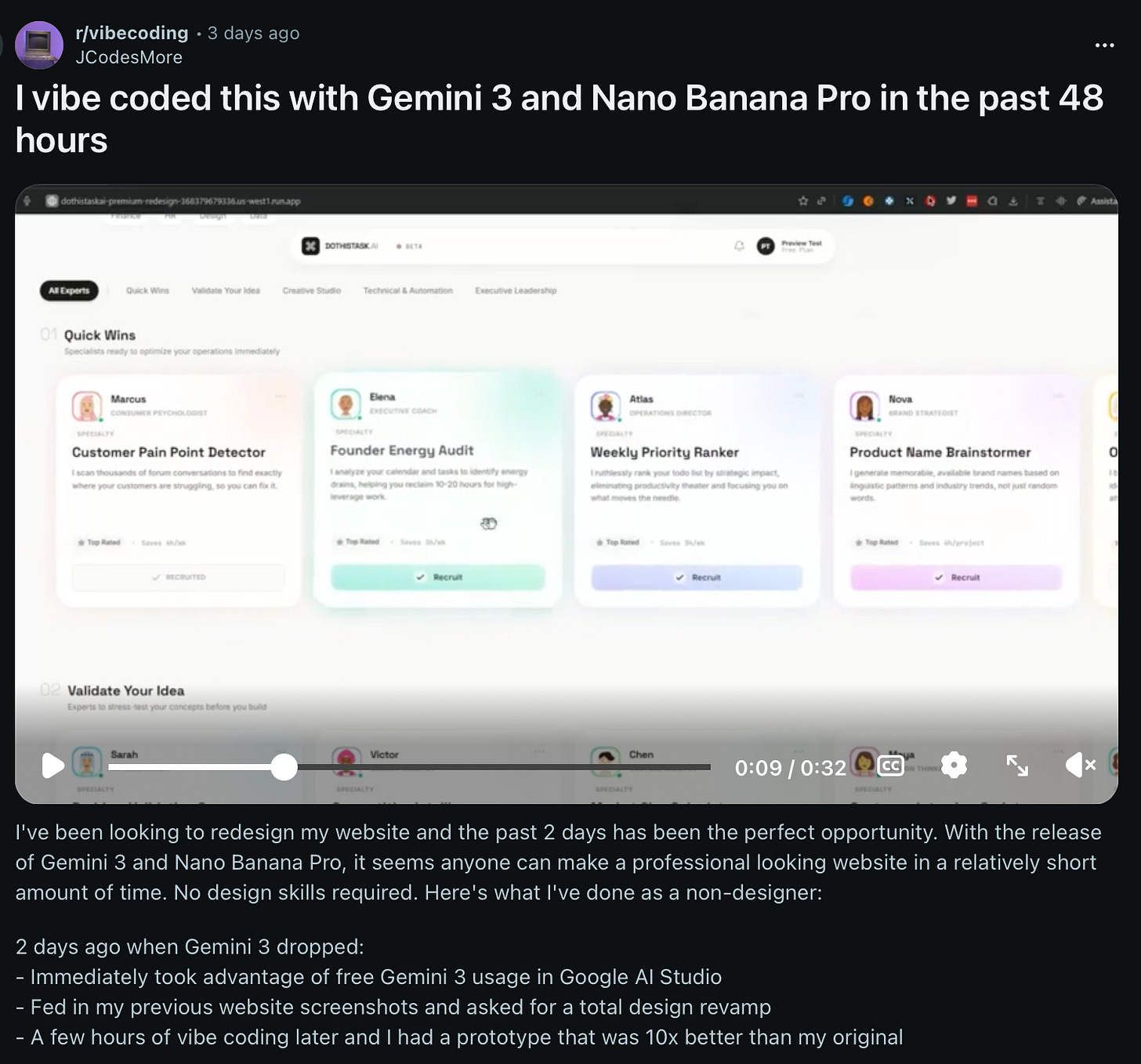 In a Reddit post, the founder of dothistask.ai shared how they used Gemini 3 and Nano Banana to redesign their entire website.