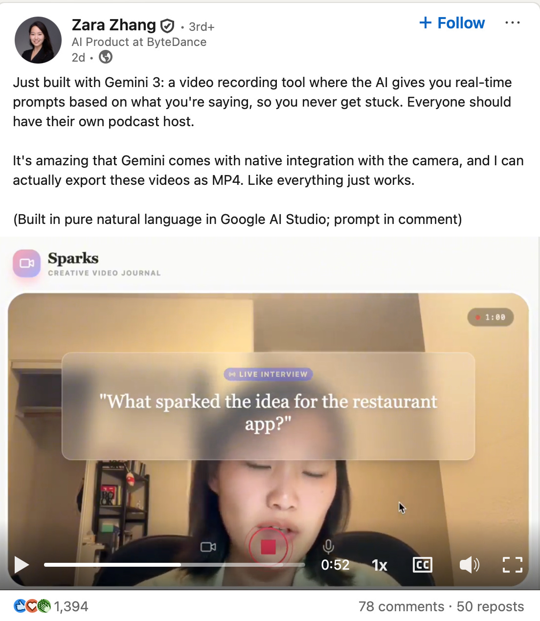 Zara Zheng built an app that asks her questions while she’s recording a video. Perfect for podcasters or video creators who never want dead air.