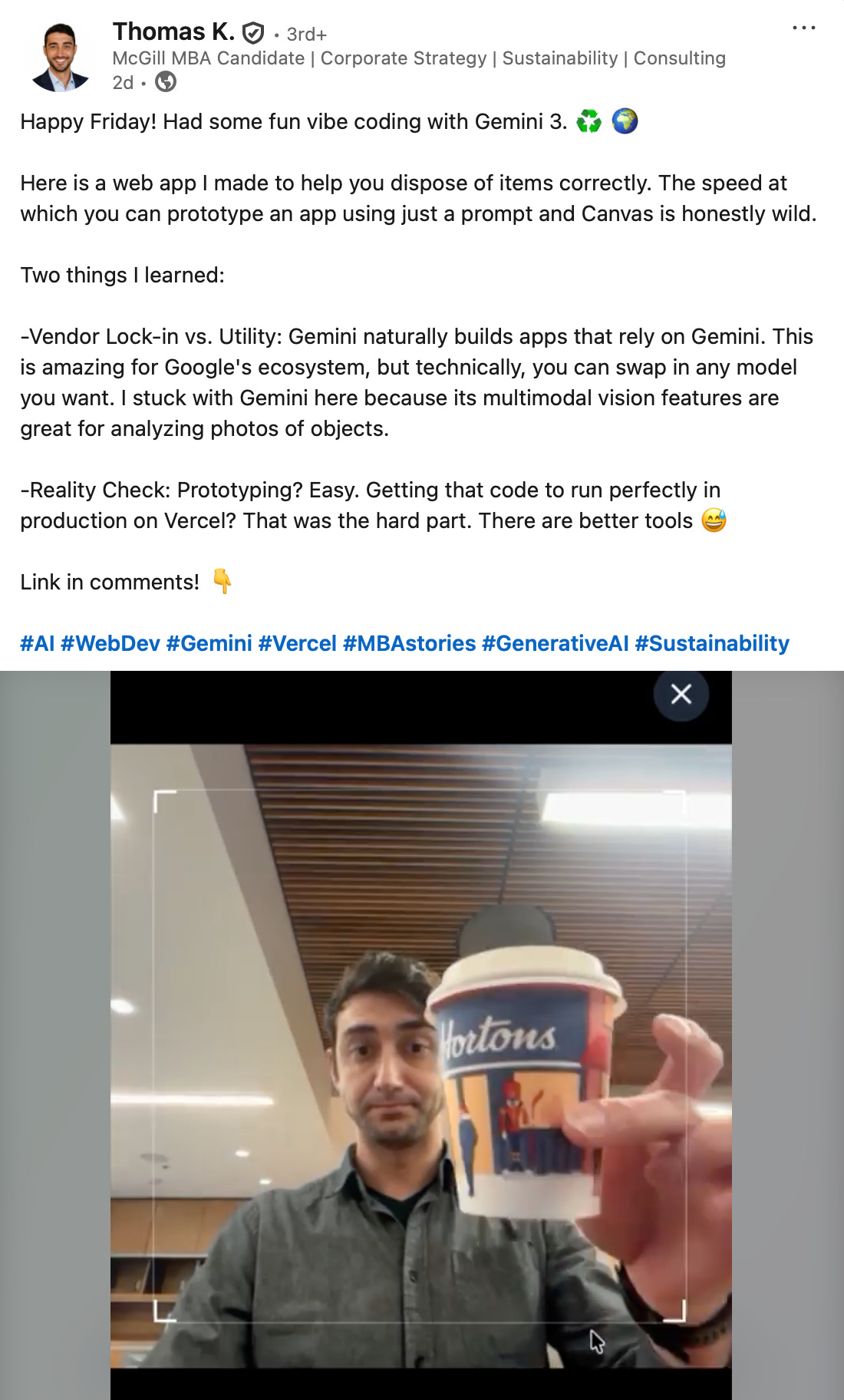 Thomas K., a MBA candidate from McGill university, built an app that recognizes waste types and tells you how to properly dispose of them.