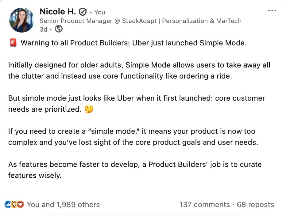 Some of the comments on my LinkedIn post about Uber got me thinking more deeply about when Simple Mode does & doesn’t apply, so I wanted to elaborate on some common anti-patterns that prevent teams from building simple products.